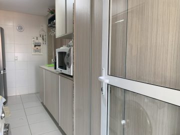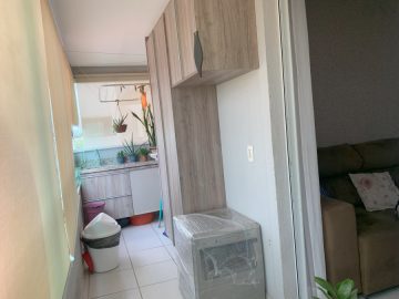-Sacada com revestimento em pedra, pia e armario, fechada com blindex